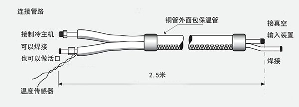 連接管路,連接管路是由兩根銅管和保溫材料組成,兩端均可以焊接也可做成活口,長度可以根據(jù)用戶需求制作,由于管路本身要作為熱負載來考慮,所以當(dāng)管路長度超過4m時,則應(yīng)選擇大一些的產(chǎn)品。