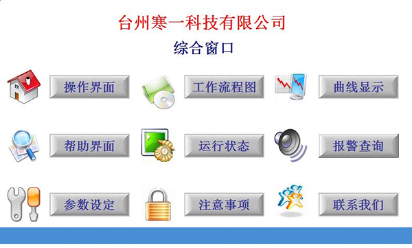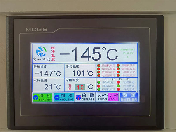 溫度顯示:制冷溫度、待機溫度、冷卻水水溫等多路溫度顯示,運行狀態(tài)欄有待機運行、制冷運行、除霜運行等狀態(tài)顯示,故障報警欄有水溫高報警、水溫高停機、電源缺相、壓縮機過載、排氣溫度過高等保護措施