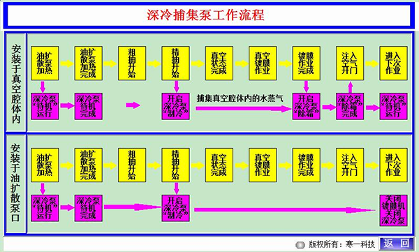 工作流程圖:改圖詳細介紹了深冷捕集泵跟真空鍍膜機配合使用時,深冷泵開關(guān)機時間,開啟制冷的時間和開啟除霜的時間,以便發(fā)揮捕集泵最佳性能。